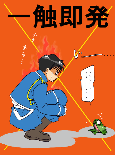 エドたちの所で、不死軍団に焔を浴びせるシーン、けっこう派手で大佐って強かったんだなあって(おい)思ったり!いつも皆にまともに相手されてない、軟弱なイメージだったから、忘れてた(笑)決めるときのギャップが激しいよね。対ラスト戦とかもそうだったし。(作画もぱねえし。w)・・・そこが大佐の魅力ですよね。ギャップ萌えです。カッコイイです。