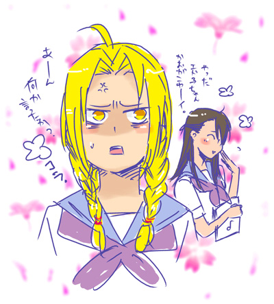 b096.jpg眠いしひどく疲れたので落書きしてから寝ようと思って描いた、女子高生エド、リン。